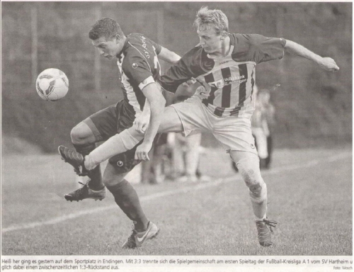 Zum ersten Saisonspiel der neuen Kreisliga-A-Saison empfingen wir den SV Hartheim auf dem Endinger Sportgelände. In einem abwechslungsreichen Spiel ging der Gast in der 22. Minute mit 1:0 in Führung, welche Bujar Bajraj jedoch in der 30. Minute durch einen direkt verwandelten Freistoß ausgleichen konnte. Nur 4 Minuten später konnte Hartheim durch einen ebenfalls direkt verwandelten Freistoß wieder in Führung gehen und durch einen Strafstroß in der 42. Minute noch vor dem Seitenwechsel auf 3:1 erhöhen.